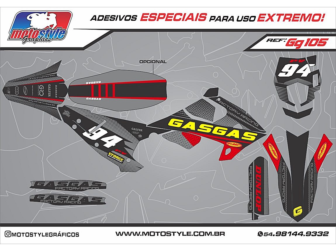 NO KIT COMPLETO ESTÁ INCLUSO ADESIVOS DE : Aletas de tanque , paralama dianteiro e traseiro , farol ou number plate, protetor de canela ( invertida ) ou canela de suspensão ( susp normal ) , tampas laterais traseiras ,caixa de ar e balança.