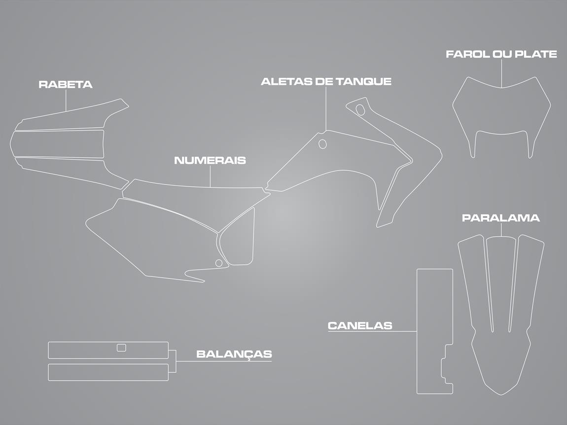 NO KIT COMPLETO ESTÁ INCLUSO ADESIVOS DE : Aletas de tanque , paralama dianteiro e traseiro , farol ou number plate, protetor de canela ( invertida ) ou canela de suspensão ( susp normal ) , tampas laterais traseiras ,caixa de ar e balança.