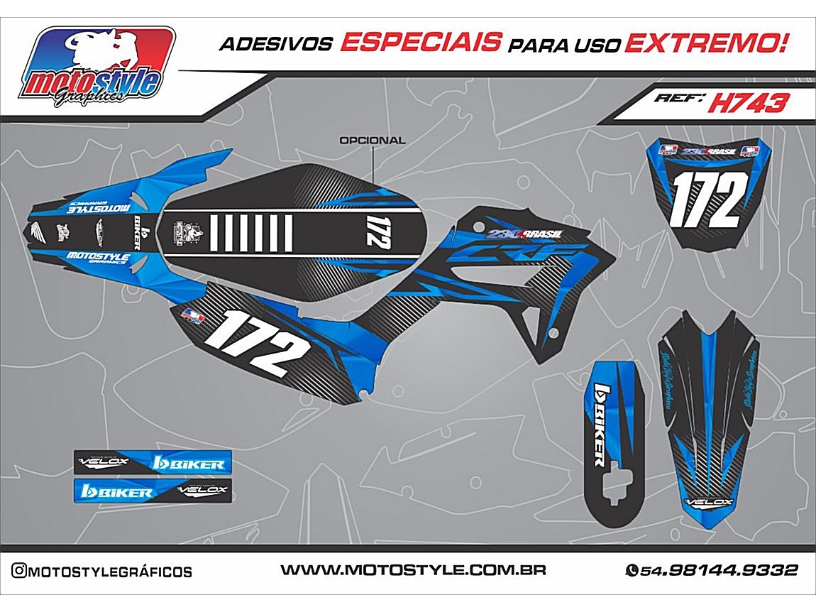NO KIT COMPLETO ESTÁ INCLUSO ADESIVOS DE : Aletas de tanque , paralama dianteiro e traseiro , farol ou number plate, protetor de canela ( invertida ) ou canela de suspensão ( susp normal ) , tampas laterais traseiras ,caixa de ar e balança.