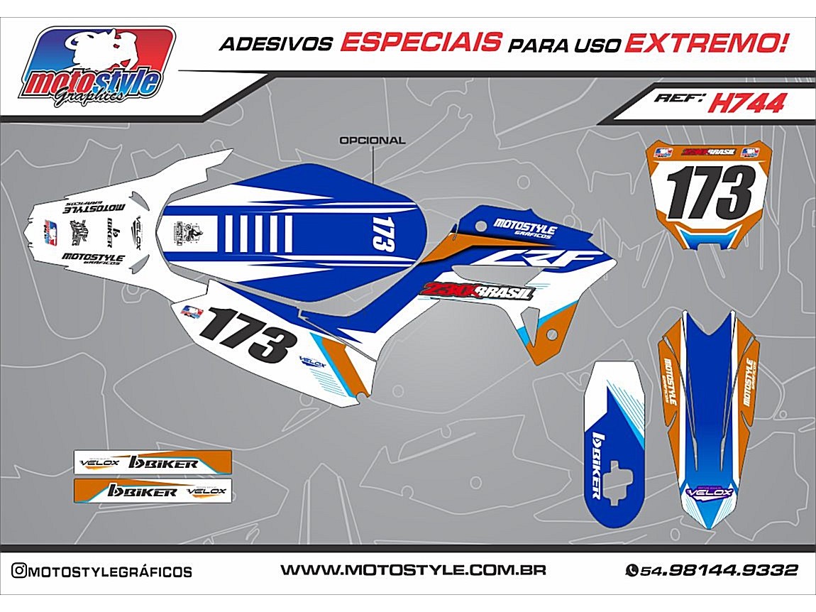 NO KIT COMPLETO ESTÁ INCLUSO ADESIVOS DE : Aletas de tanque , paralama dianteiro e traseiro , farol ou number plate, protetor de canela ( invertida ) ou canela de suspensão ( susp normal ) , tampas laterais traseiras ,caixa de ar e balança.