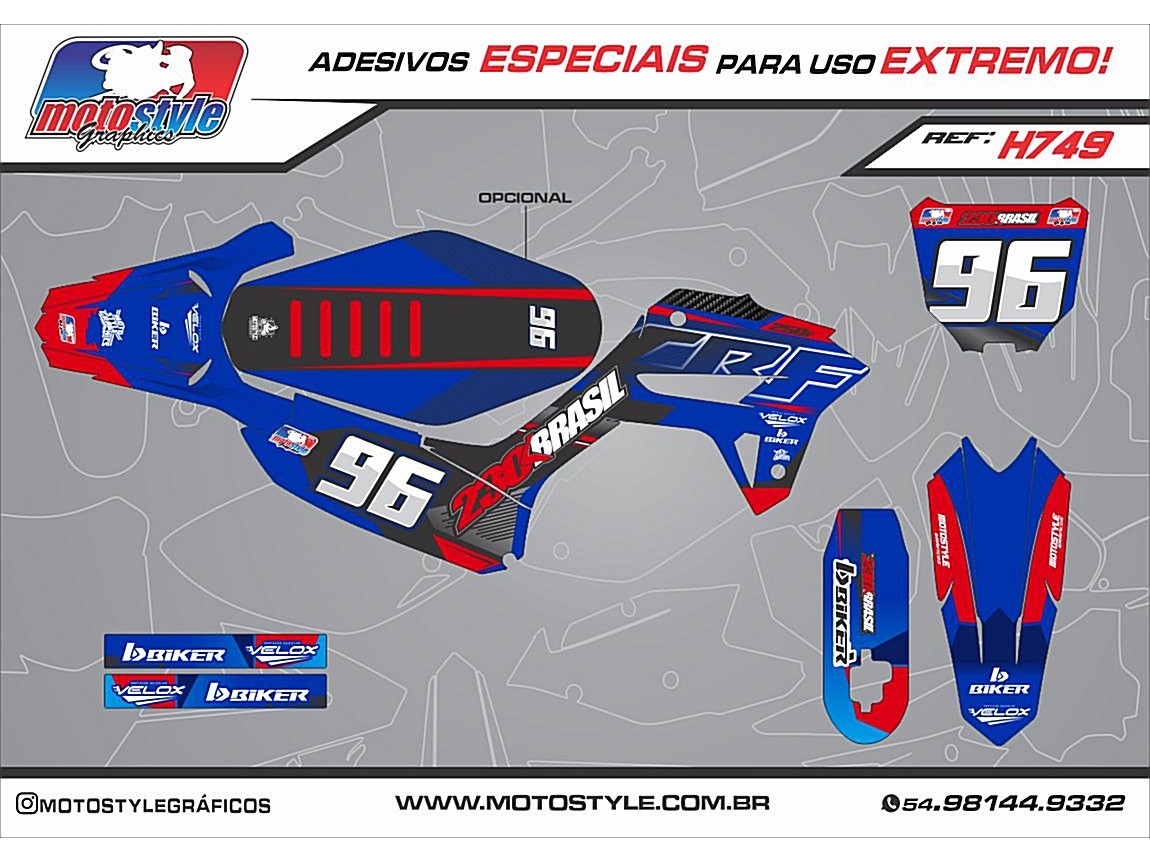 NO KIT COMPLETO ESTÁ INCLUSO ADESIVOS DE : Aletas de tanque , paralama dianteiro e traseiro , farol ou number plate, protetor de canela ( invertida ) ou canela de suspensão ( susp normal ) , tampas laterais traseiras ,caixa de ar e balança.