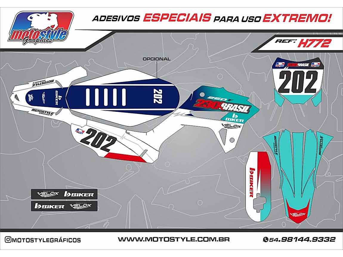 NO KIT COMPLETO ESTÁ INCLUSO ADESIVOS DE : Aletas de tanque , paralama dianteiro e traseiro , farol ou number plate, protetor de canela ( invertida ) ou canela de suspensão ( susp normal ) , tampas laterais traseiras ,caixa de ar e balança.