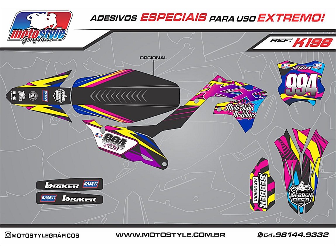 NO KIT COMPLETO ESTÁ INCLUSO ADESIVOS DE : Aletas de tanque , paralama dianteiro e traseiro , farol ou number plate, protetor de canela ( invertida ) ou canela de suspensão ( susp normal ) , tampas laterais traseiras ,caixa de ar e balança.