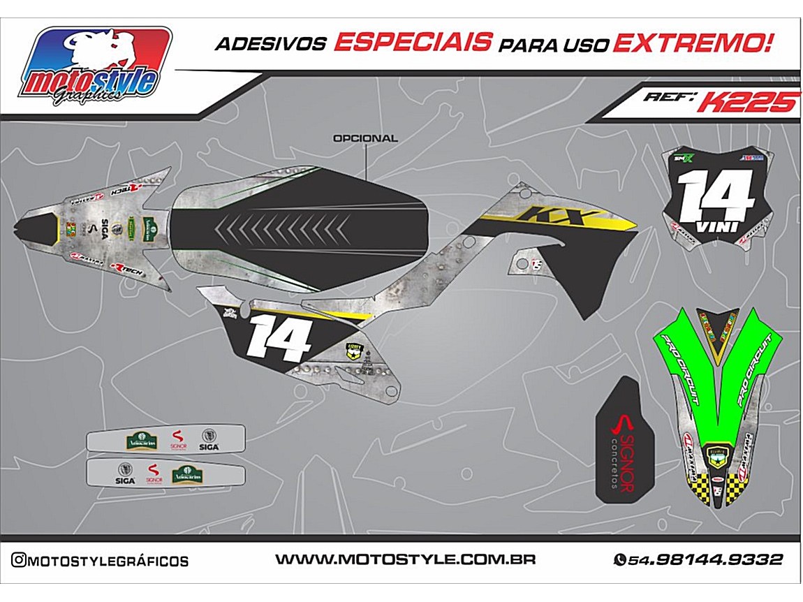 1º Passo : Escolha o tipo de gráfico que você quer ( fosco, brilho,metalizado ou full metalizado ) e o modelo de arte, que ajustaremos para os moldes da sua moto. Todos os gráficos podem ser feito alterações de nome, números, logos, cores e etc, conforme o cliente achar necessário. Por favor nos informar se tiver alguma peça ou detalhe fora de original da sua moto para que possamos acertar antes de fazer o desenho..
